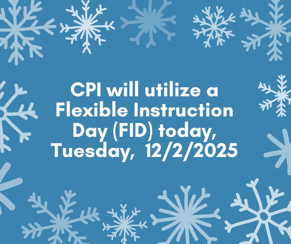 Theresa Brickley2025-12-02T06:07:15-05:00CPI will utilize a Flexible Instruction Day (FID) today, December 2, 2025 due to the expected severe weather forecast. No in-person classes will be held! The high school teachers have discussed their expectations for Flexible Instruction Days with their classes so every CPI student should know what is expected of them. Post-secondary instructors have made the necessary arrangements with their classes for remote learning as well. If you have questions, please reach out to the instructor for assistance and/or clarification. If you need administrative help, please contact Jessica Martin at jmartin@cpi.edu for high school related questions or Todd Taylor at ttaylor@cpi.edu [...]