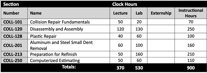 Emphasizing both technical expertise and career readiness, the program includes I-CAR Certification Training, ensuring students meet industry safety and technical standards. Students will also gain experience with estimating software, insurance procedures, and customer service skills to prepare them for real-world collision repair environments. Graduates will be equipped for a variety of career opportunities, including positions as auto body technicians, refinishers, estimators, or shop managers. The program consists of 370 lecture hours and 530 lab hours, blending classroom instruction with hands-on application in a professional learning environment.